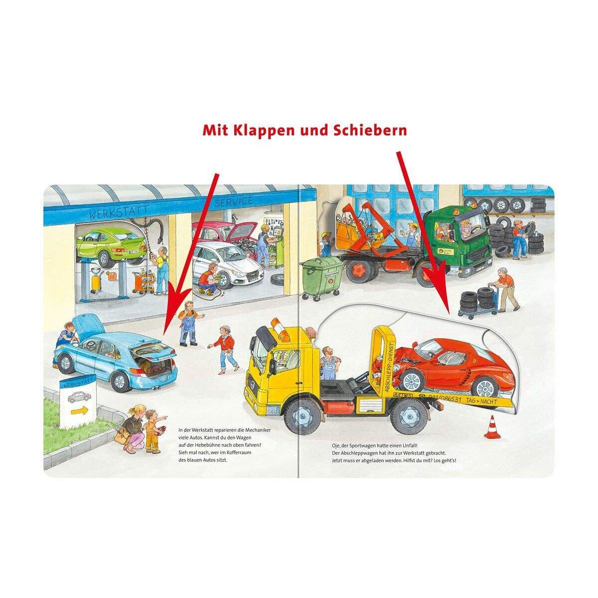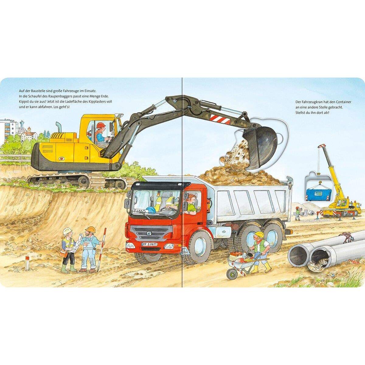 Ein Spielbuch mit vielen Schiebern und Klappen für kleine Fahrzeugfans. Es ist viel zu tun: Mülltonnen ausleeren, die Erde aus der Baggerschaufel auf den Lkw kippen und die Paletten mit dem Gabelstapler aufladen. Alles aufgeladen? Bereit zur Abfahrt!