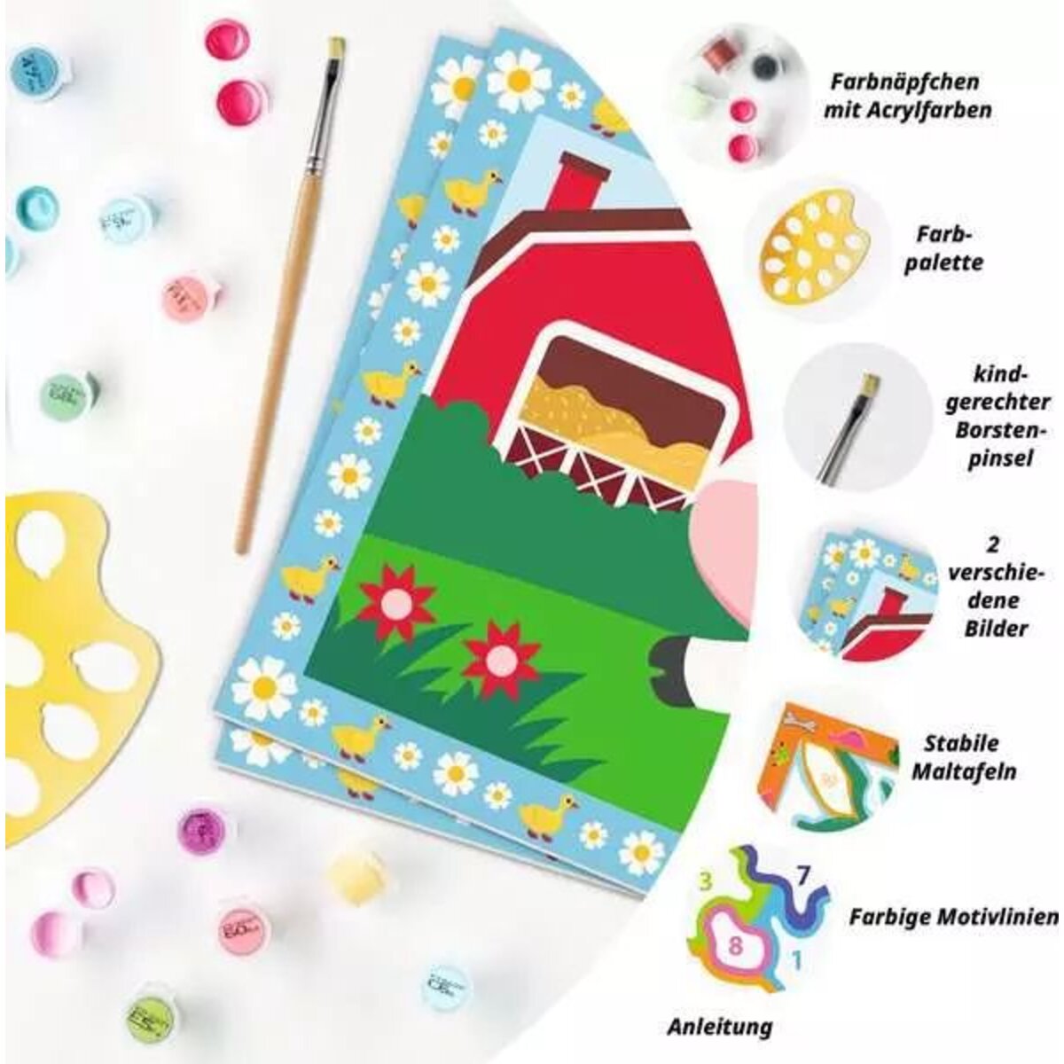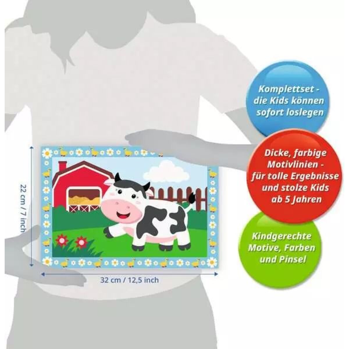 Dank der farbigen Motivlinien, die die Malfelder umranden, können die Kinder das ganze Motiv und die Farben schneller erkennen. Das farbenfrohe Motiv Auf dem Bauernhof ist eine tolle Geschenkidee für Kinder von 5-7 Jahren und eine schöne Dekoration für das Kinderzimmer. In diesem Malset sind 5 fertig gemischte Acrylfarben und ein Pinsel enthalten.