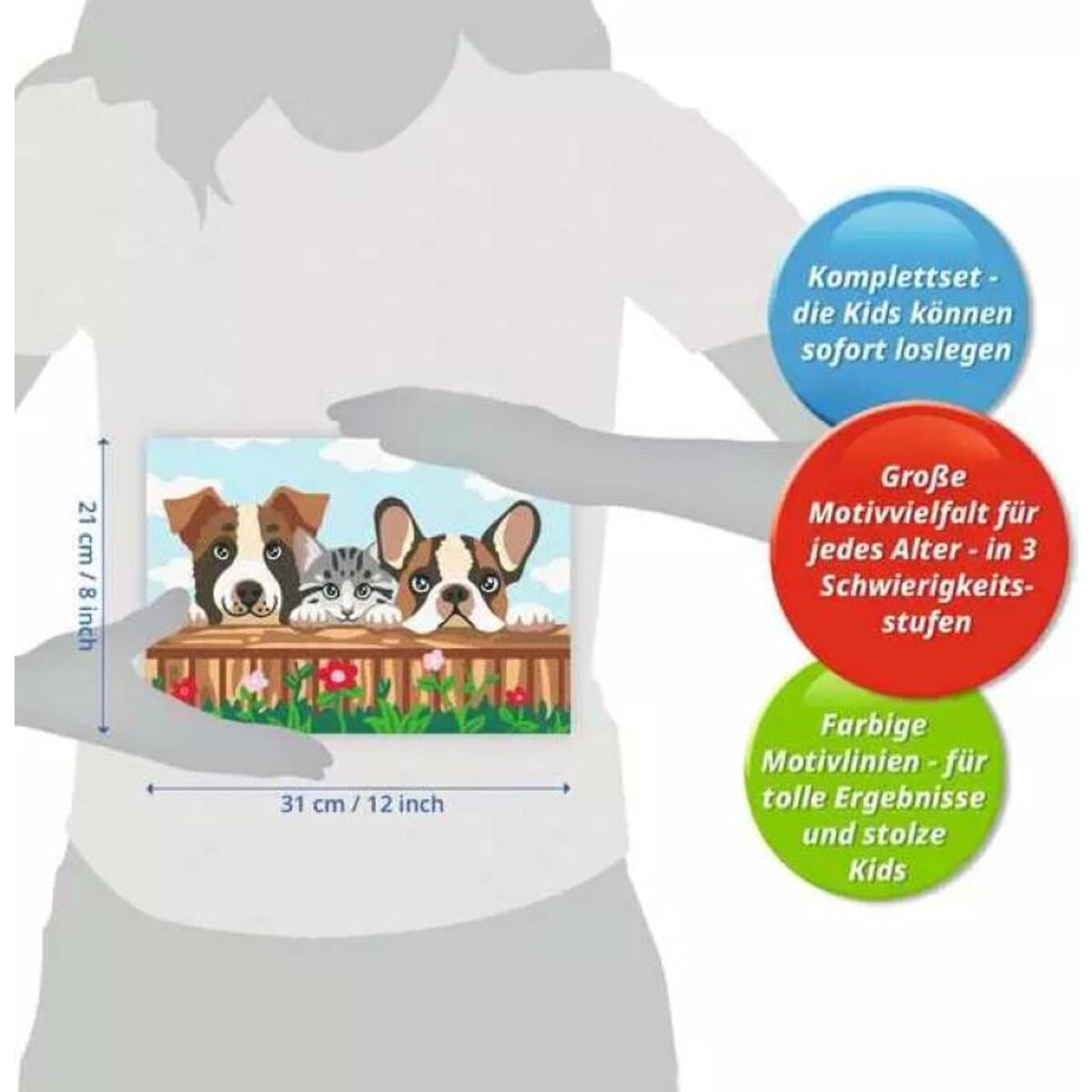 Die Motive sind altersgerecht in drei Schwierigkeitsstufen umgesetzt: von einfachen Bildern mit wenigen, großen Malflächen bis hin zu Bildern mit vielen, kleinen Malflächen für Fortgeschrittene.