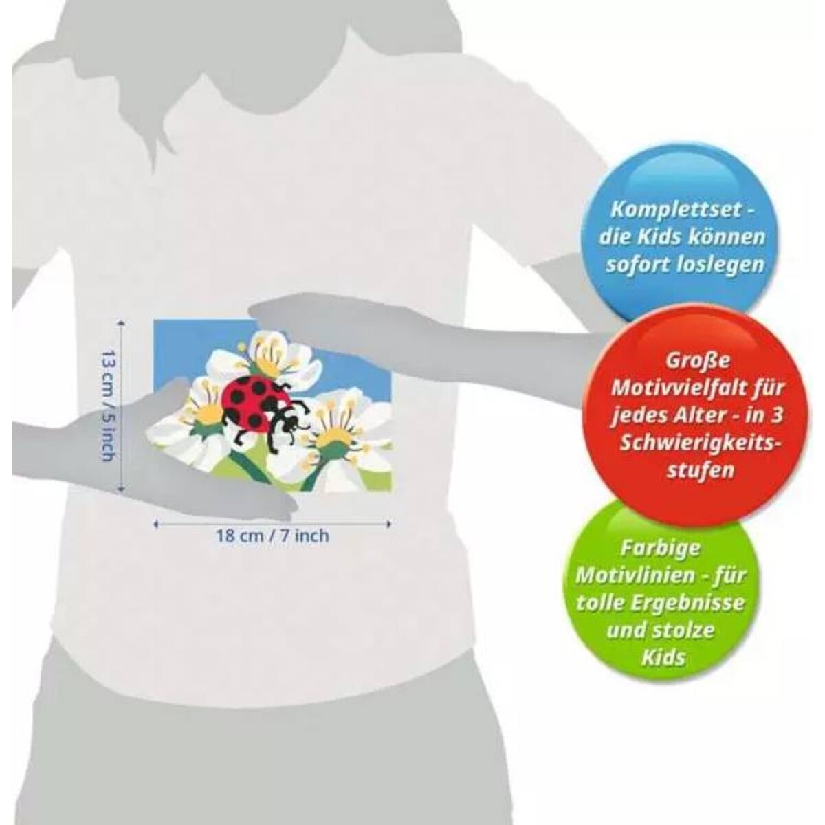 Die Motive sind altersgerecht in drei Schwierigkeitsstufen umgesetzt: von einfachen Bildern mit wenigen, großen Malflächen bis hin zu Bildern mit vielen, kleinen Malflächen für Fortgeschrittene.