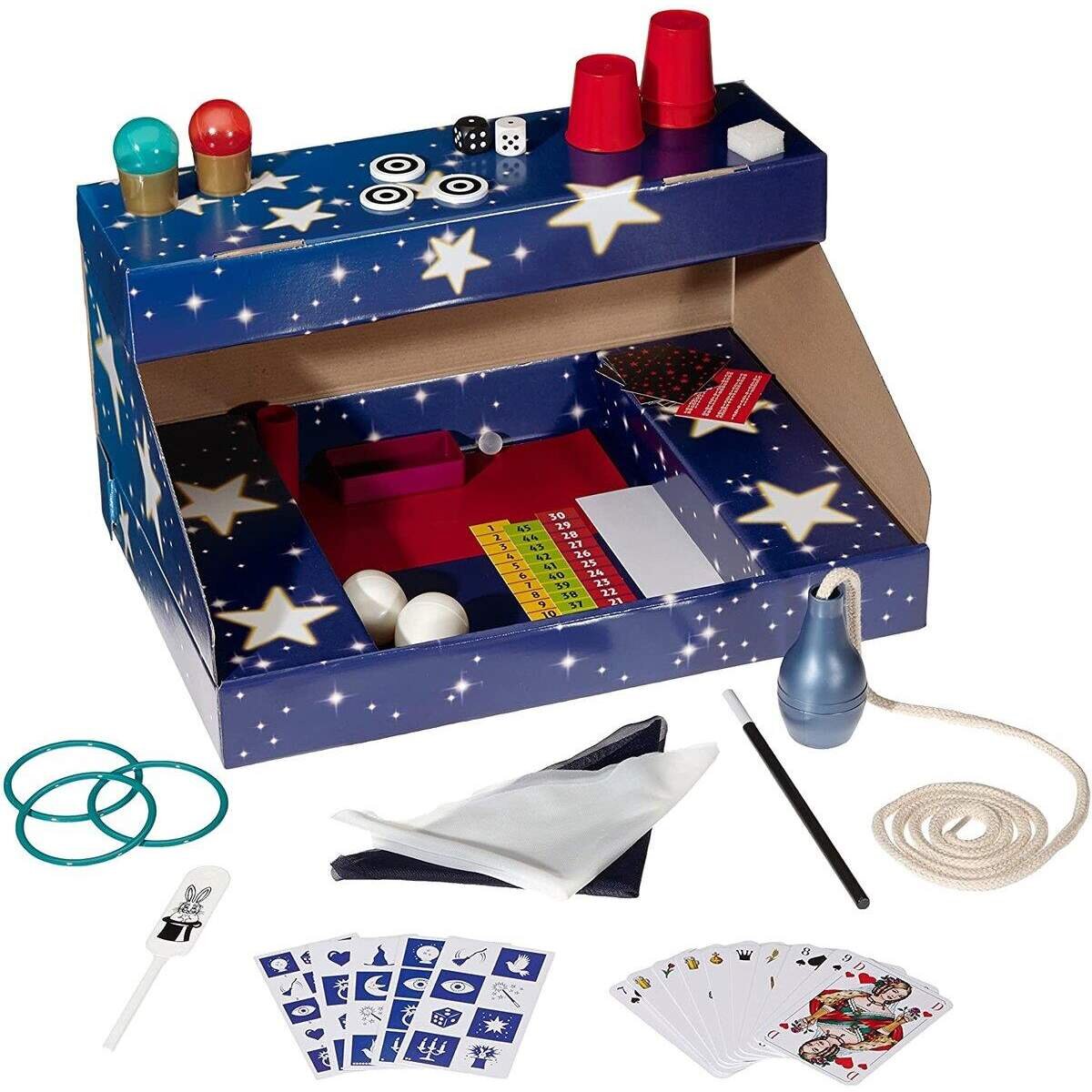 Inhalt/Ausstattung: 1 Zauberstab, 1 Zauberschnur, 1 Zauberkelle, 2 Tücher, 2 Zauber-Eier, 1 Seilvase mit Kugel, 4 Chips, 1 Schale, 5 Becher, 3 Ringe, 2 Bälle, 4 Schaumstoff-Würfel, 1 Zauberfolie, 1 geheime Röhre, 10 Zauberkarten, 5 Bilderkarten, 7 Zahlenkarten, 3 Zahlenstreifen, 2 Holzwürfel, 1 Klebestreifen, 1 Gummiband.