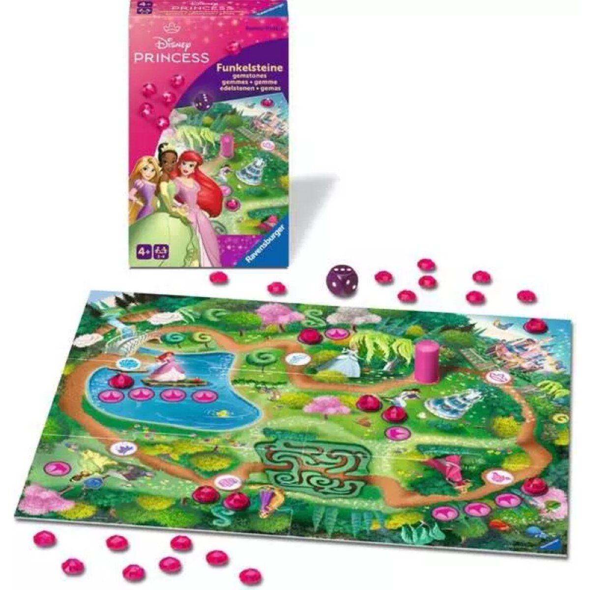 In diesem zauberhaften Laufspiel dreht sich alles um Edelsteine. Sobald ein Spieler eine der Prinzessinnen erreicht hat, legt er einen Funkelstein bei ihr ab. Sobald aber alle freien Plätze mit den funkelnden Juwelen aufgefüllt sind, dreht sich das Spiel und die Steine dürfen vom Spielplan genommen werden. Wem gelingt es mit Würfelglück und etwas Mut zum Risiko die meisten Funkelsteine zu ergattern? Ein hübsch gestaltetes Sammelspiel im kompakten Mitnahmeformat für 2-4 Disney-Fans ab 4 Jahren.