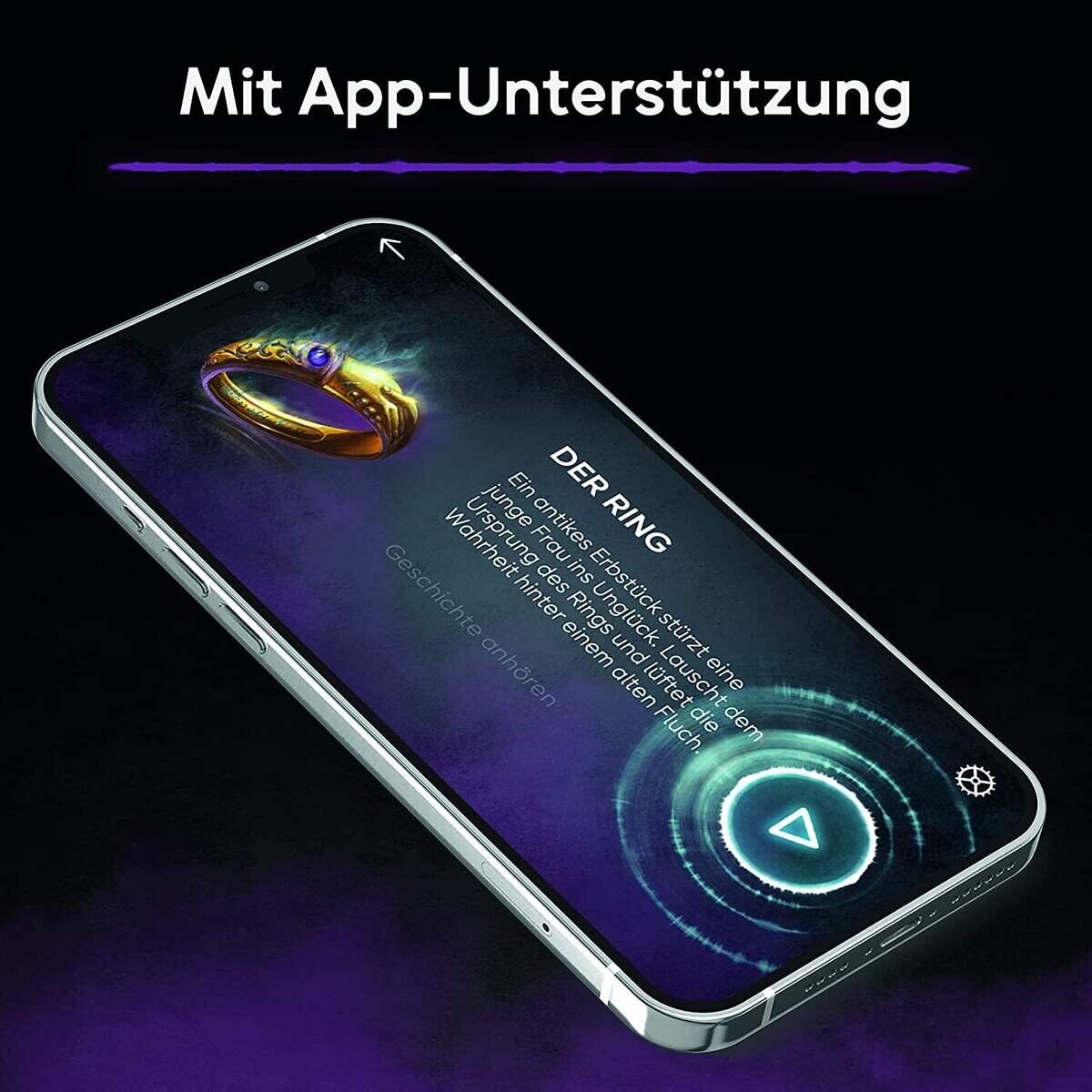 Ein antiker Ring stürzt eine junge Frau ins Unglück. Liegt etwa ein Fluch darauf? Das Echo der Vergangenheit birgt die Wahrheit über den Ring und dessen Geschichte. echoes ist ein einzigartiges, kooperatives Audio Mystery Spiel. Die Spieler hören mithilfe der kostenlosen Ravensburger echoes App mysteriöse Geräusche und Stimmen, die mit den Kartenmotiven verbunden sind. Gemeinsam bringen sie die 24 Teile der Geschichte in die richtige Reihenfolge, um den Fall zu lösen. Die kostenlose Ravensburger echoes App wird zum Spielen benötigt. Im Lauschen-Modus der App können die Spieler die Sounds abspielen. Im Lösen-Modus überprüfen die Spieler jeweils vier Karten auf ihre Reihenfolge, um Kapitel für Kapitel zu lösen. Zum Schluss müssen die Spieler die gesamte Geschichte in die richtige Reihenfolge bringen, um den Fall zu lösen. Für ein optimales Spielerlebnis mit Kamera-Erkennung wird ein Gerät mit folgenden Anforderungen benötigt: Mindestens iPhone 6s mit iOS 12.0 oder neuer / Android-Gerät mit mindestens Android 7.0 und kompatibel mit den Google-Play-Diensten für AR (Diese können auf manchen Geräten nachträglich installiert werden). Falls das Gerät diese nicht erfüllt, kann per manueller Eingabe gespielt werden.