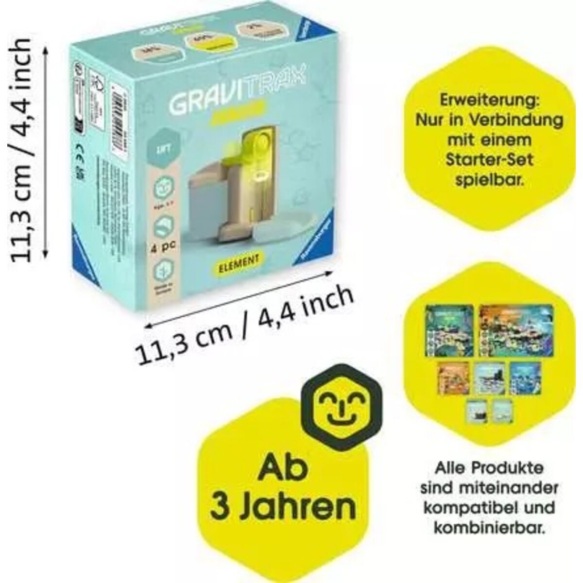 Das GraviTrax Junior Element Lift sorgt mit einem beeindruckenden Action-Effekt für spannende Höhen! Mit dem GraviTrax Junior Element Lift wird die Kugel mehrere Ebenen nach oben befördert. Somit können noch spannendere Streckenverläufe realisiert werden. Eine Kugel sowie eine Slope sind inklusive. Actionspaß für Jungs und Mädchen ab 3 Jahren ist garantiert. Das Element ist mit allen GraviTrax Junior Starter-Sets kombinierbar. Alle Bauteile bestehen aus Holz-Biokunststoff. GraviTrax Junior ist ein interaktives Kugelbahnsystem für Jungen und Mädchen ab 3 Jahren: Mit GraviTrax Junior bauen Kinder nicht nur einfache Kugelbahnen. Durch individuelles Dekorieren mit liebevoll gestalteten Elementen erschaffen Kinder ihre eigenen Themenwelten. Bei GraviTrax Junior werden altersgerechte Lerninhalte thematisiert. Motorische Fähigkeiten und räumliches Denken werden durch das freie Konzipieren der Kugelbahnen gefördert. Durch das Erforschen des Rollverhaltens der Kugeln wird das Prinzip von Ursache und Wirkung hautnah erlebt. Das Spielen mit den (Tier-)Figuren und das Dekorieren der Themenwelten fördern das kreative Rollenspiel und die Fantasie der Kinder. Durch verschiedene Erweiterungen können Kinder ihre Kugelbahnen vergrößern und immer wieder neu gestalten - langanhaltender Spielespaß garantiert.