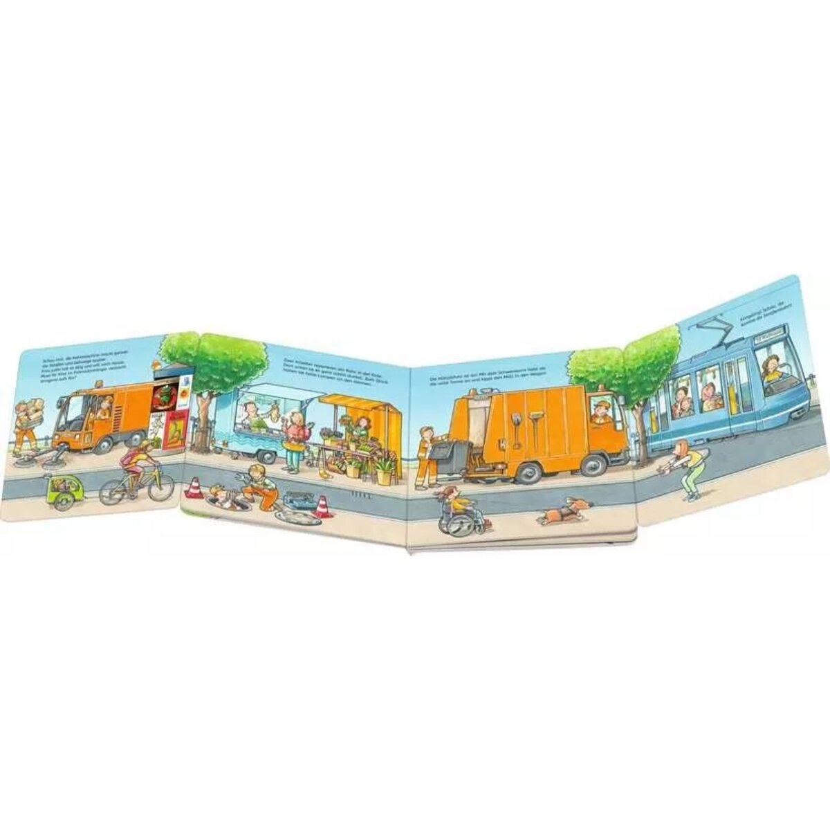 Hier finden kleine Kinder spannende Fahrzeuge in Aktion: Bagger, Mähdrescher, Feuerwehr und viele mehr. Werden die Seiten ausgeklappt, gibt es weitere Fahrzeuge zu entdecken und es entsteht ein großes Panorama.