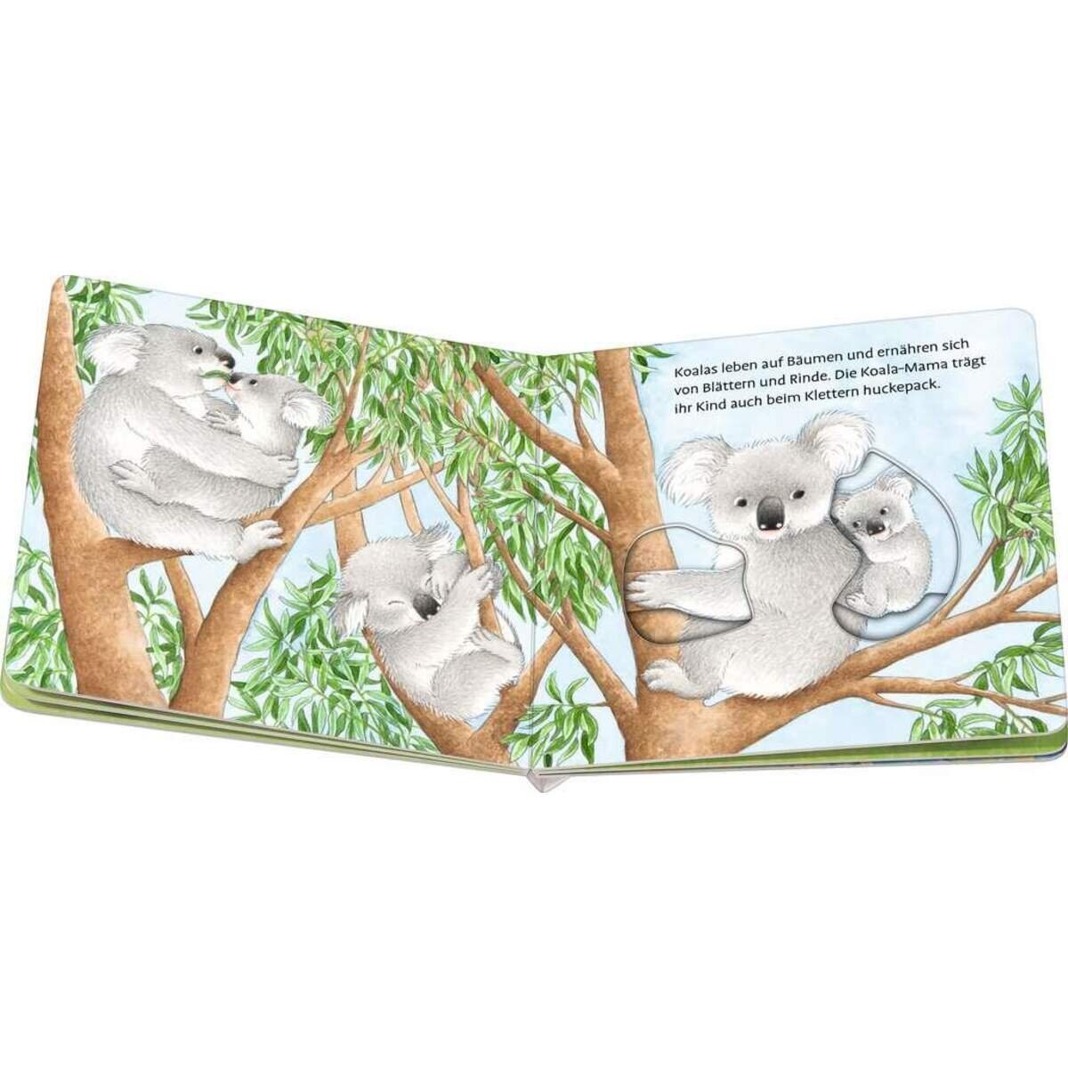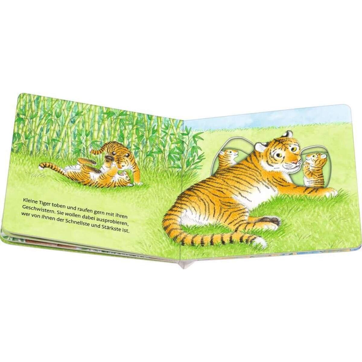 Der kleine Panda tobt mit seinem Papa, die Tigerkinder raufen miteinander und das Koala-Baby kuschelt sich bei Mama an.