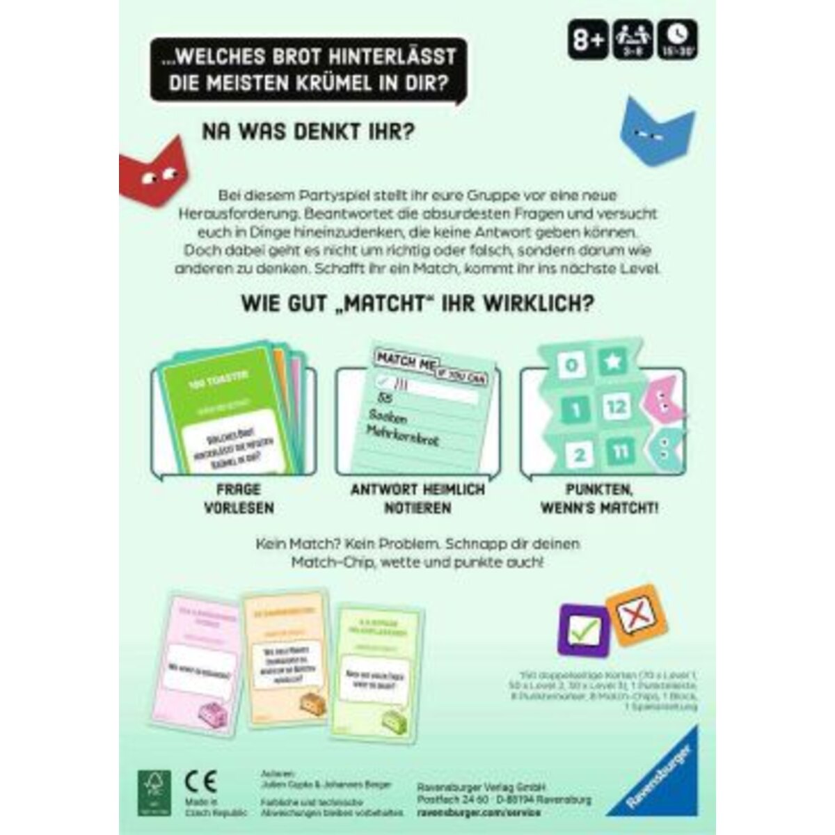 Match Me - Das Partyspiel mit High Five-Garantie. 300 kuriose Fragen bieten nicht nur Gesprächsstoff sondern auch witzige Momente zwischen Spielern. Alle Spieler denken sich gleichzeitig eine Antwort aus und schreiben sie verdeckt auf. Wenn alle eine passende Antwort gefunden haben, wird aufgedeckt. Aber aufgepasst: Hier geht es nicht darum die richtige Antwort zu finden, sondern eine Antwort, die mindestens eine andere Person ebenfalls notiert hat. Denn dann heißt es: Level Up! Level Up: Ihr geht gemeinsam in die nächste Runde. Die Anderen wetten jetzt auf die Siegreichen, wird es ein neues Match geben? Bei Match Me zählt nicht das Wissen sondern seine Mitspieler besonders gut zu kennen. Doch wie antworten diese, wenn die Frage unbeantwortbar ist. Was denken Suppenschüsseln, welches die beste Suppe ist? Wie werden Brote am liebsten belegt? Wie viele Kissen braucht ein Hotelbett? Match Me ist ein Partyspiel für alle Anlässe, das Gesprächsstoff bietet und Spieler dazu bringt sich in unzählige Alltagsgegenstände reinzudenken. Bis zu 8 Personen können sich so besser kennenlernen, Spaß haben und einfach mal Quatsch erzählen. Kommunikation steht im Vordergrund, aber Match Me ist trotzdem noch ein Spiel, wer zuerst 13 Punkte hat gewinnt! Sei es durch richtiges Wetten oder passendes Antworten.
