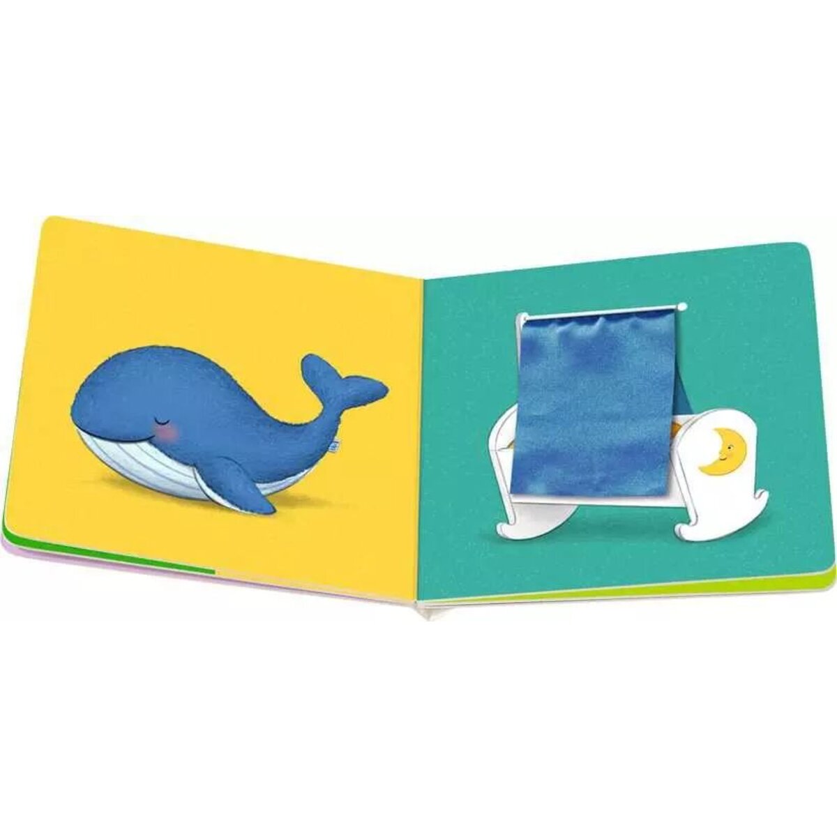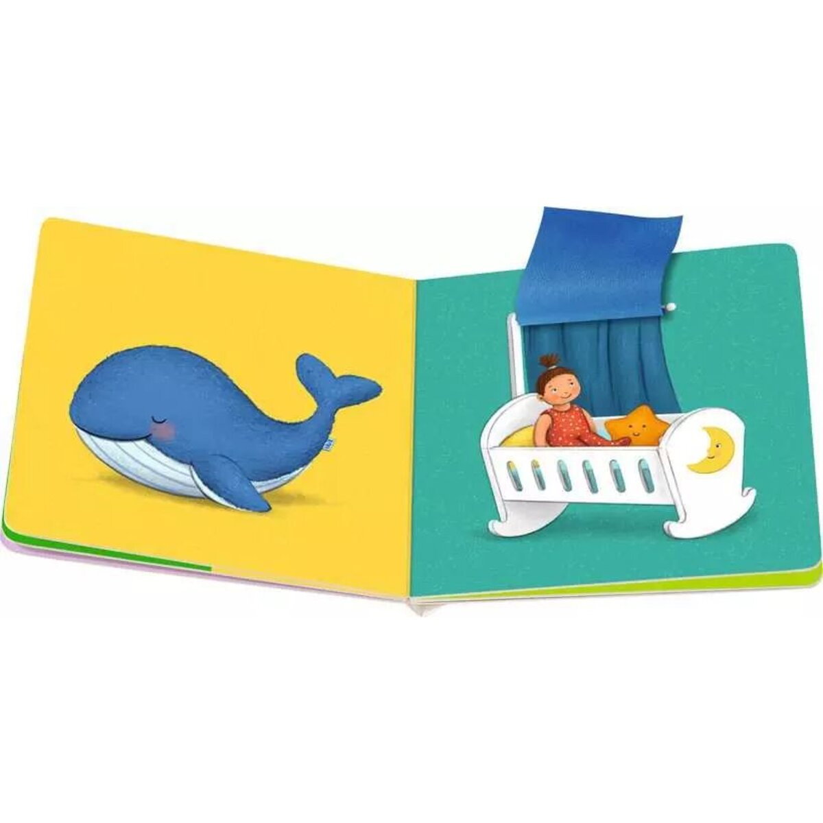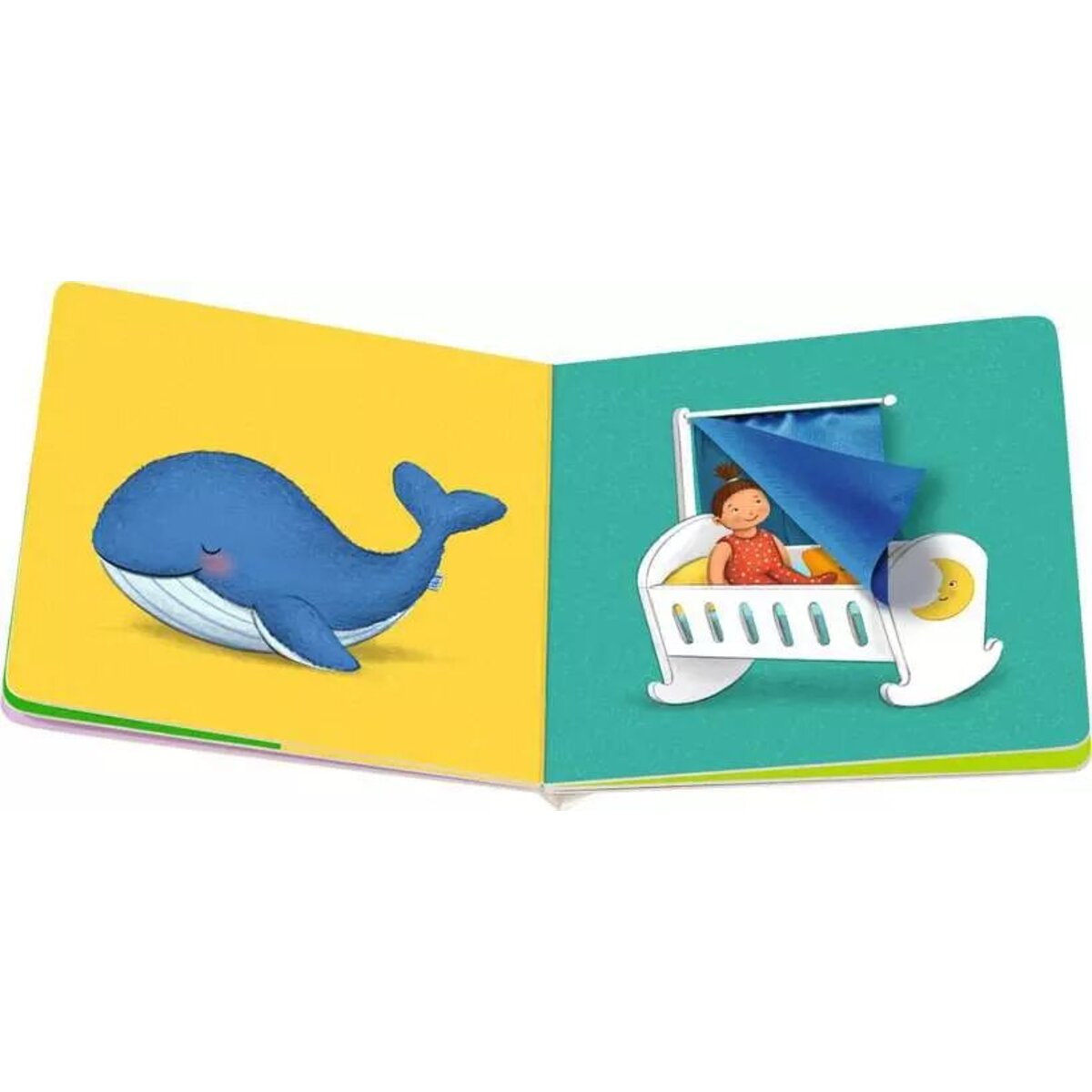 Abwechslungsreiche und hochwertige Fühlteile machen dieses Fühlbuch aus: Im Babybett kann der Wiegenschleier zur Seite geschoben werden. Guck, guck! Wer liegt denn schon im Bett?