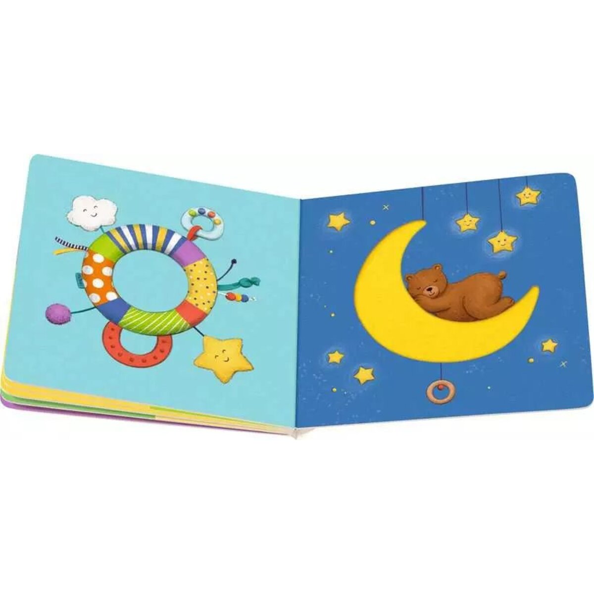Die fröhlichen Bilder sind perfekt auf die Bedürfnisse der Jüngsten abgestimmt. Sie zeigen bekannte Motive aus dem Kinderalltag (Schlafsack, Greifling, Babybett) und die liebsten Tiere (Schäfchen, Hase und Katze).