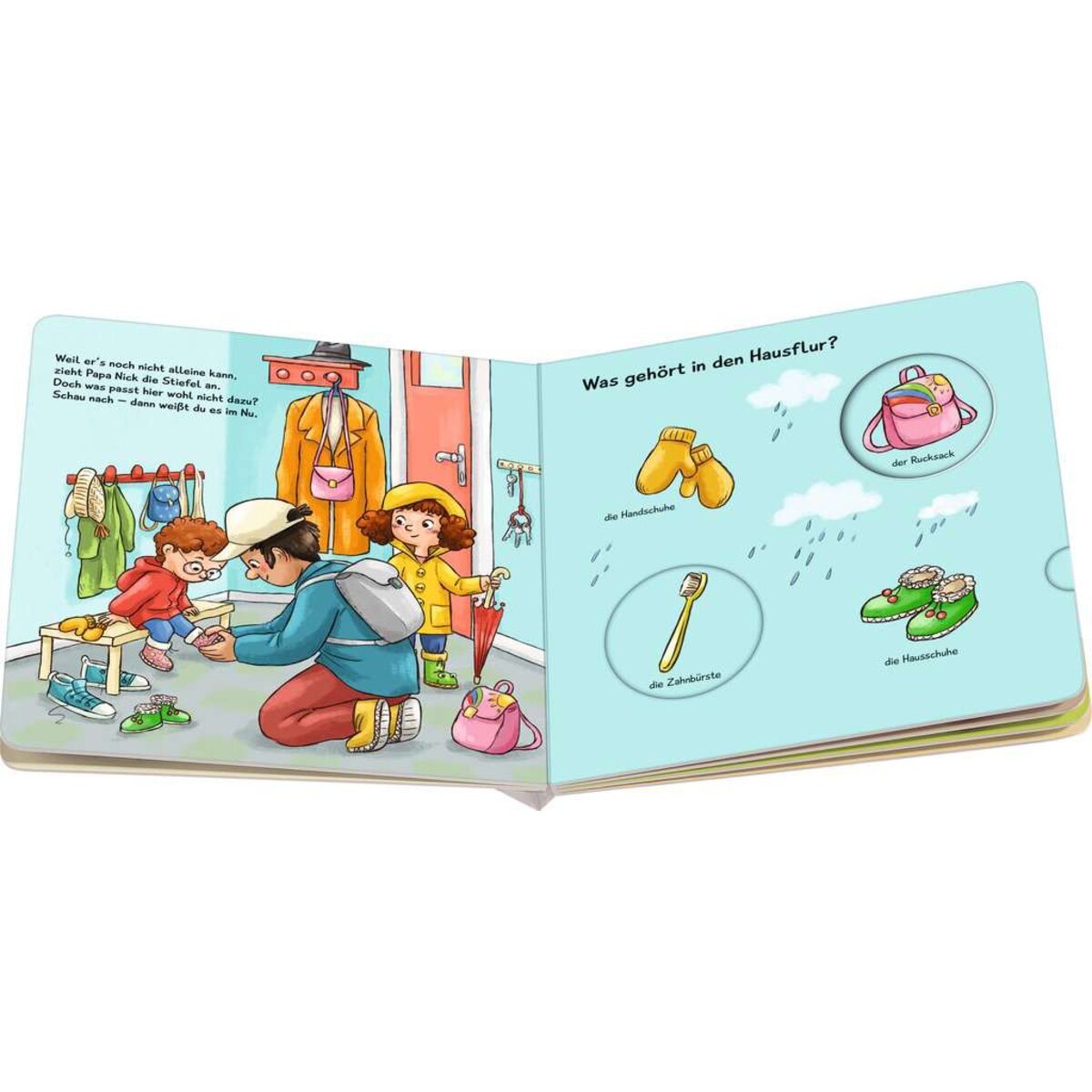 Was passt hier nicht? Großer Schiebespaß kombiniert mit einem lustigen RatespielZu Hause gibt es allerlei Sachen. Aber was macht die Zahnbürste im Hausflur? Und gehört der Obstkorb wirklich ins Badezimmer? Auf jeder Seite befindet sich ein falscher Gegenstand! Wie wird das Rätsel gelöst? Einfach den Schieber herausziehen und schon verschwindet der falsche Gegenstand und wird gleichzeitig durch einen neuen ersetzt, der im jeweiligen Raum tatsächlich dazugehört. Die großen und leichtgängigen Schieber sind perfekt für Kleinkinder geeignet. Ob in der Küche, im Hausflur, im Badezimmer, im Garten oder im Kinderzimmer – Kinder ab 18 Monaten können überall etwas entdecken, das nicht dazupasst. In Kombination mit lustigen Reimen sowie farbenfrohen Szenen und Vignetten bietet dieses Schiebebuch abwechslungsreichen Ratespaß. Die Spieluhr gehört nicht in den Garten? Wohin dann? Einfach die Seite umblättern und die Spieluhr im Kinderzimmer wiederfinden. Ganz nach dem Sachen suchen-Prinzip lassen sich auch alle Vignetten mit „richtigen" Gegenständen im passenden Raum suchen und finden. Durch die Reime und die Benennungen der Gegenstände wird der Wortschatz ganz spielerisch erweitert und der Spracherwerb gefördert. Die großen Schieber unterstützen die feinmotorischen Fähigkeiten.