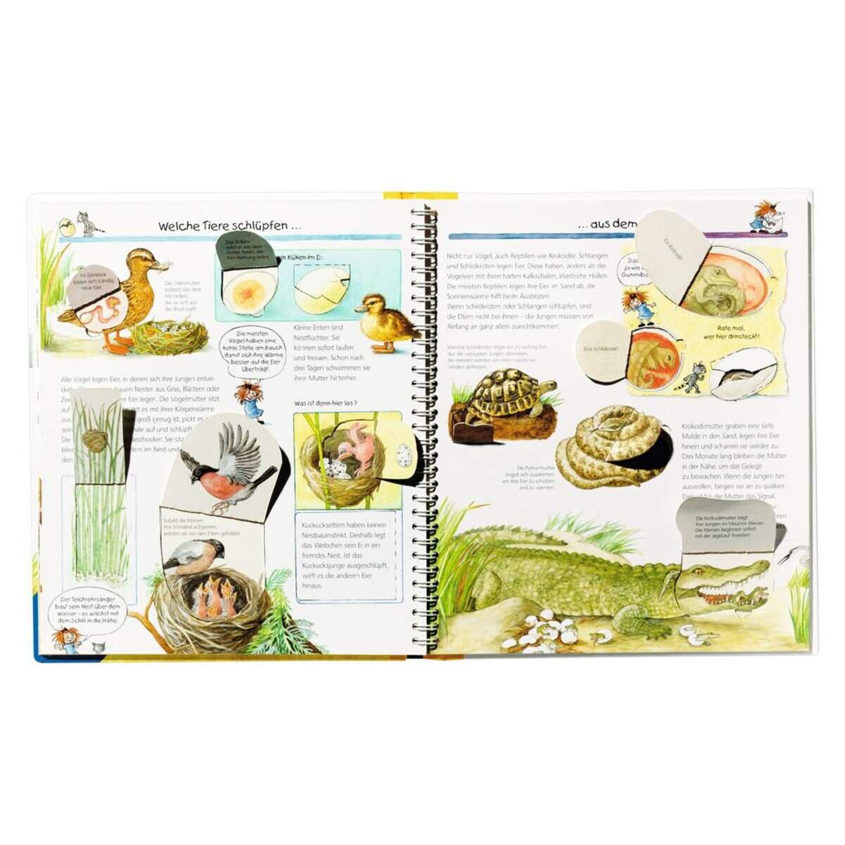 Wer weiß woher die Tierbabys kommen? Wie wird eine Raubkatze groß? Was muss ein kleiner Elefant alles lernen? Was macht das Känguru im Beutel? Mit zahlreichen überraschenden Klappen zeigt dieses Buch, wie Tierkinder bei uns und anderswo groß werden. Gehen Tierkinder auch in den Kindergarten? Weiß der kleine Elefant, was er mit seinem Rüssel tun soll? Wie viele Kinder bekommt ein Frosch? Welche Tiere legen Eier? Tausend tolle Dinge über das faszinierende Tierreich gibt es hier in Bildern und hinter überraschenden Klappen zu entdecken.