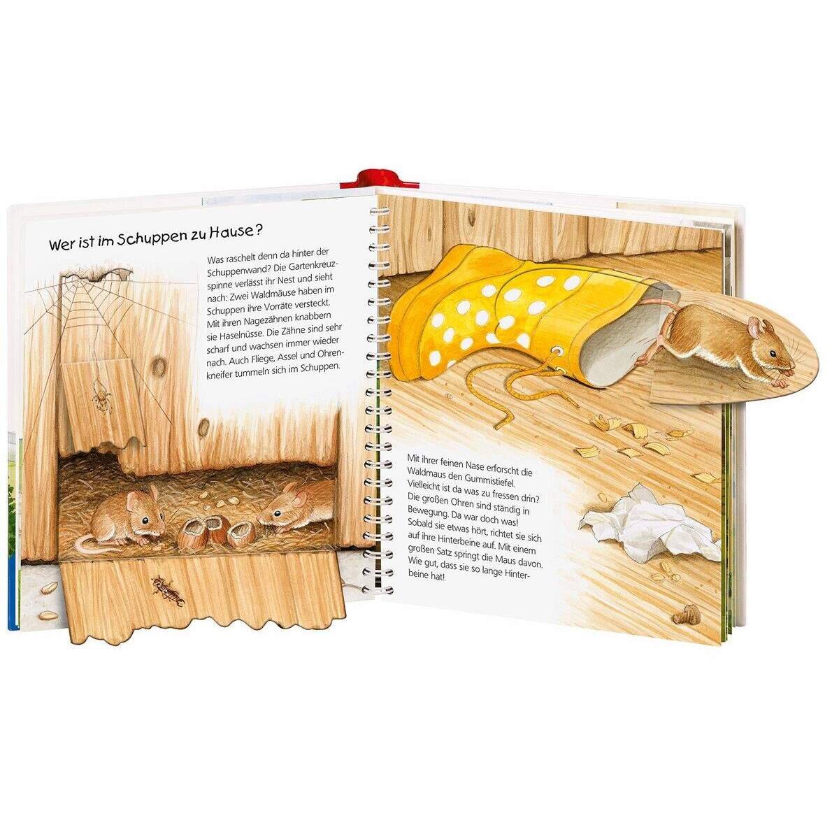 Hier summt und brummt es gewaltig! Dieses Buch nimmt kleine Naturforscher mit auf eine Entdeckungstour durch den Garten, bei der es allerlei zu sehen gibt: Wer versteckt sich hinter dem Efeu? Wo wohnt die Maus? Welche Tiere tummeln sich im Kompost? Und was frisst der Igel am liebsten? Mit spannenden Bewegungsklappen schauen wir der Eidechse beim Beutefang zu, erkunden das Nest des Zaunkönigs, und beobachten, wie Biene und Hummel Blütenstaub sammeln.