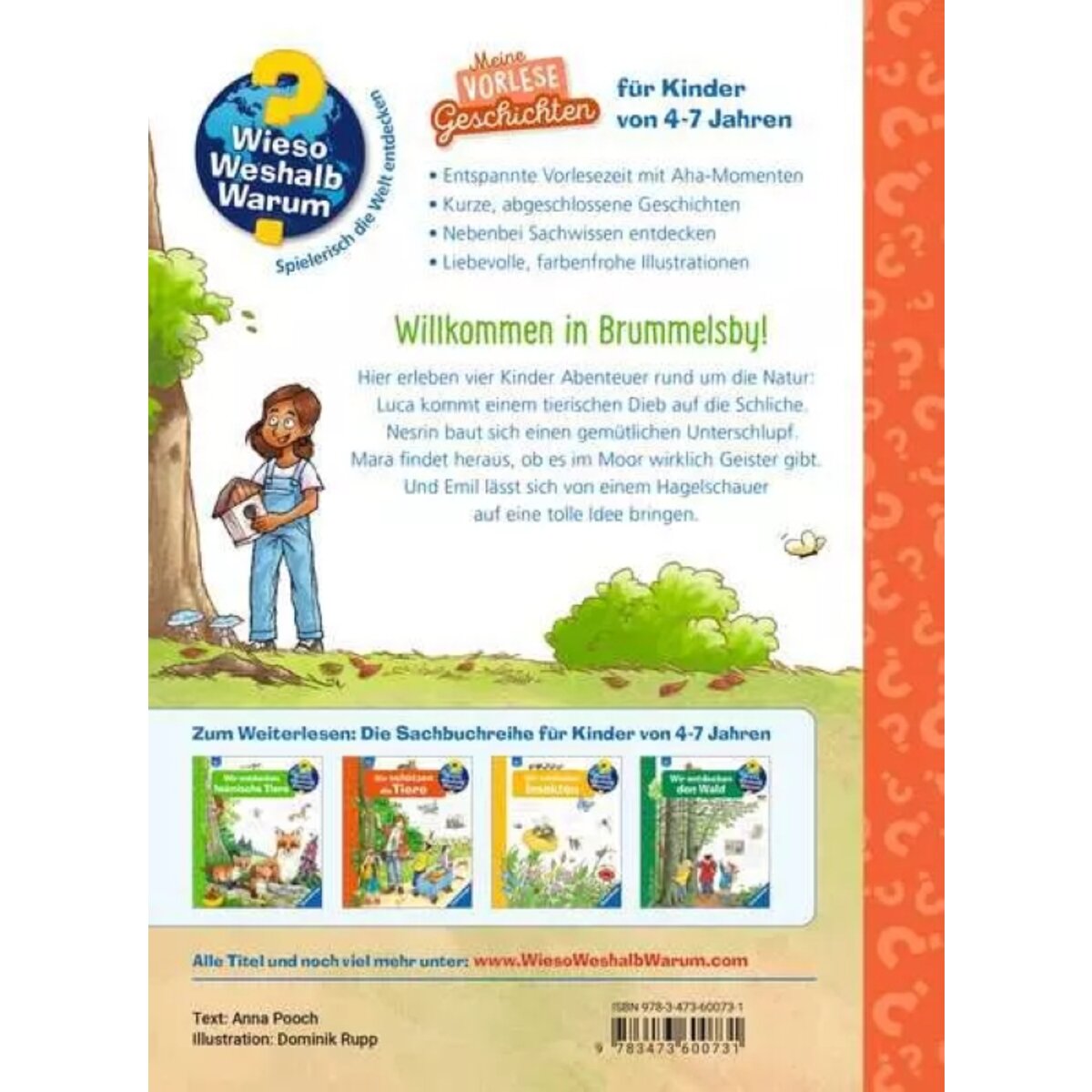 In einer Kleinstadt ganz nah an der Nordsee erleben vier Kinder jede Menge Abenteuer rund um die Natur: Luca kommt im Garten einem tierischen Dieb auf die Schliche. Nesrin baut sich ein gemütliches Nest. Mara findet bei einem Ausflug ins Moor heraus, ob es dort wirklich Geister gibt. Und Emil lässt sich von einem unerwarteten Hagelschauer auf eine leckere Idee bringen. Jede der 15 Geschichten ist in sich abgeschlossen und bietet häppchenweise Sachwissen, eingebettet in eine charmante Geschichte.