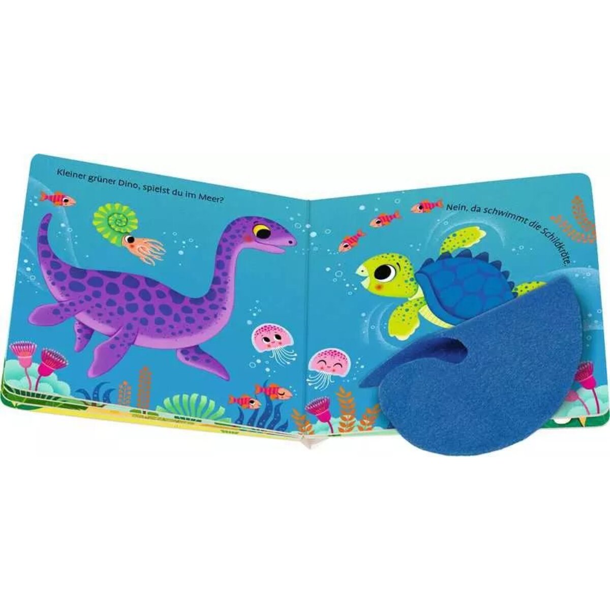 Bereits kleine Kinderhände öffnen spielend leicht die stabilen Fühlklappen aus dickem Stoff. Ein kurzes Frage-Antwort-Spiel weckt dabei die Neugier der Kleinsten und unterstützt spielerisch beim Sprechenlernen.