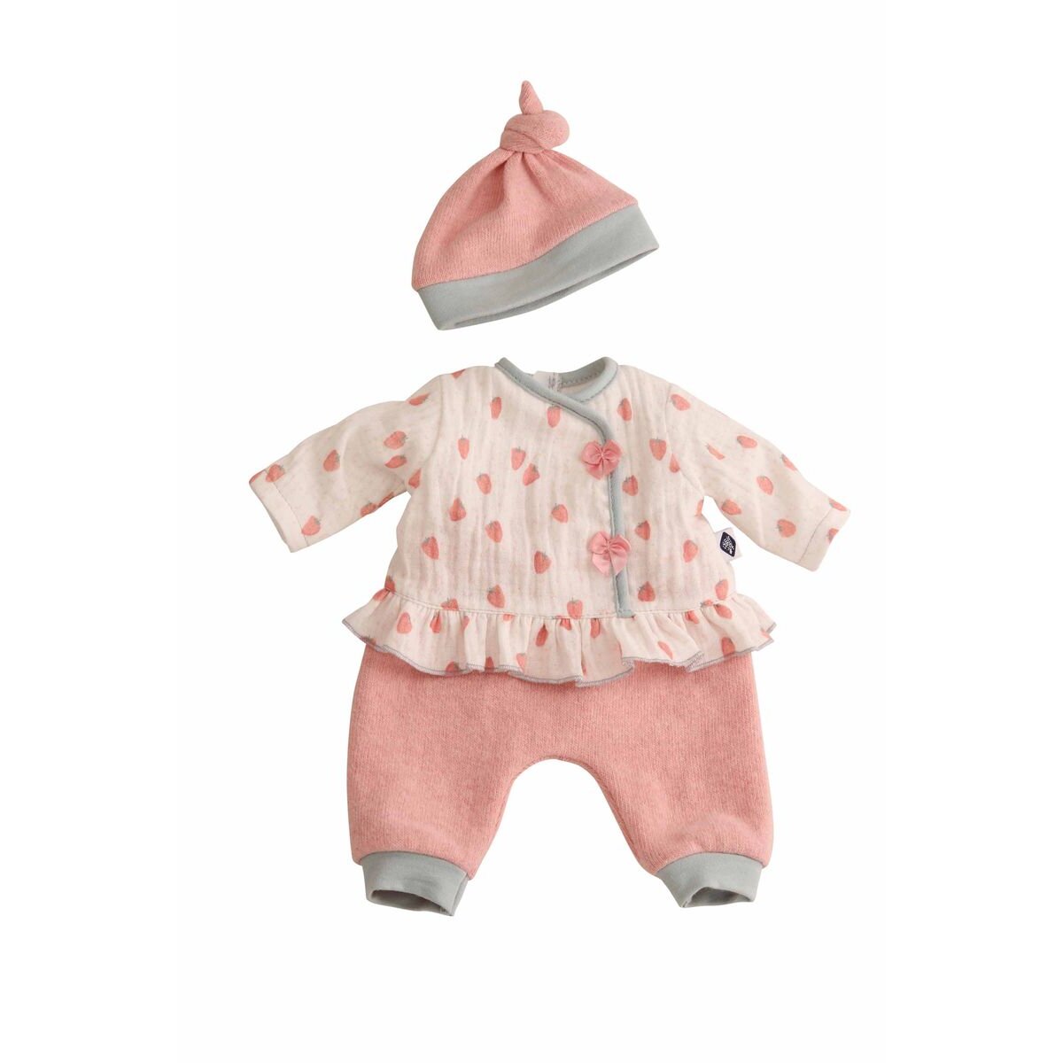 Kleidung bestehend aus einer rosa Strickhose, eine Tunika weiss mit Erdbeerdruck und eine passende rose Strickmütze.