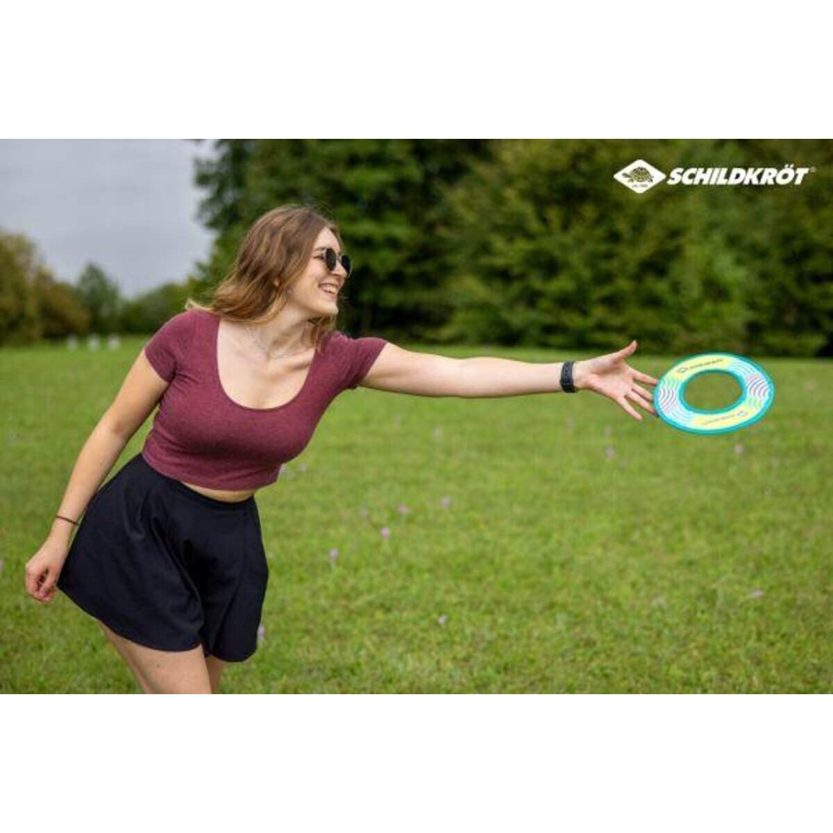 Der Neopren-Wurfring Ø 24cm aus dem Hause Schildkröt vereint tolle Flugeigenschaften mit geringem Verletzungsrisiko. In das weiche, griffige Neopren-Material wird hierzu ein Kunstleder-Kern eingenäht, der dem Ring etwas mehr Gewicht gibt. Dadurch stabilisiert sich das weiche Neopren bei der Rotation am Flug und der Ring fliegt sehr präzise und weit. Das Neopren-Material im neuen Design macht den Ring zusätzlich schön griffig. Er lässt sich gut werfen und fangen. Der Schildkröt Neopren-Wurfring ist salzwasserfest und schnelltrocknend und damit der ideale Begleiter auch für Strand und Meer.