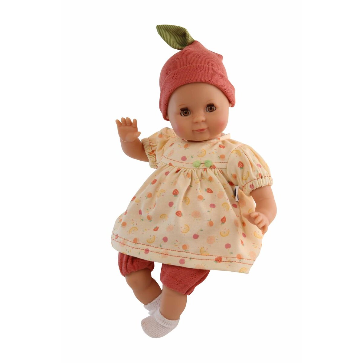 Mein erstes Schlummerle, die beliebteste und bekannteste Puppe, ohne Haare für die Kleinsten. Ein unverwechselbares Gesicht vereint Qualität und Spielwert und begeistert schon seit Generationen unsere Puppenmuttis. Die Puppe wird in unserer eigenen Puppenmanufaktur in Rauenstein/Thüringen hergestellt. Arme, Beine und Kopf sind aus Vinyl, sie hat lustige braune Schlafaugen und gemalte Haare. Es trägt eine rote kurze Leggings, ein rose Kleid mit Erdbeeren bedruckt und die passende rote Mütze dazu. Die Kleidung ist leicht an- und ausziehbar und bei 30 Grad per Hand waschbar.