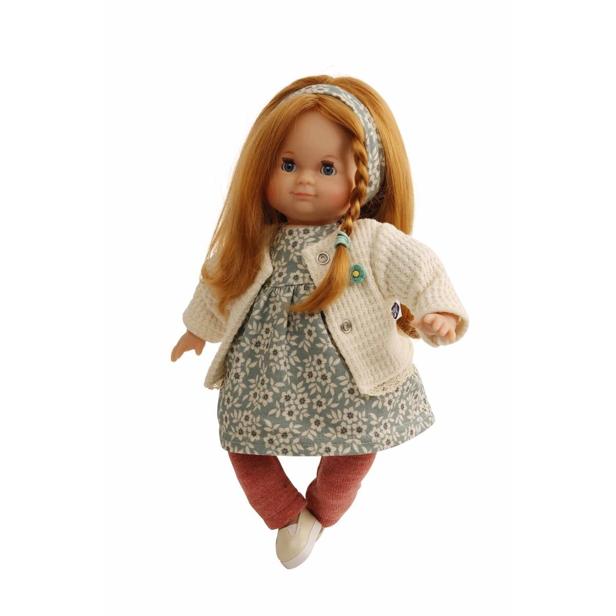 Die Puppe wird in unserer eigenen Puppenmanufaktur in Rauenstein/Thüringen hergestellt. Arme, Beine und Kopf sind aus Vinyl, sie hat lustige blaue Schlafaugen, sowie strapazierfähige, kämmbare, eingesteppte rote Haare. Es trägt eine moderne Spielkleidung in rot/weiss/blaugrün, diese ist leicht an- und ausziehbar und bei 30 Grad per Hand waschbar.