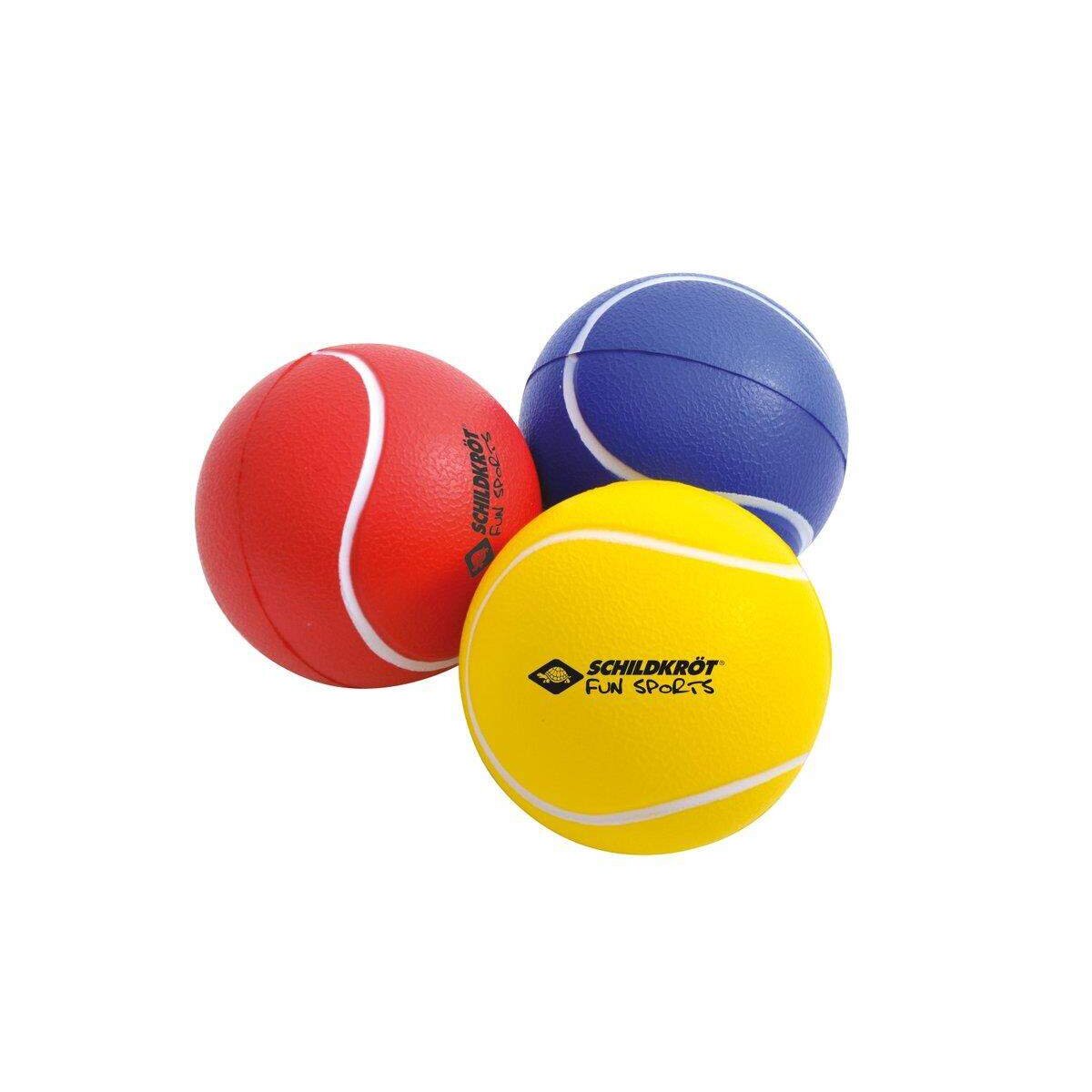 Die neuen Soft-Bälle aus hochwertigem PU-Schaumstoff Ø7cm von Schildkröt sorgen für viel Spaß bei unzähligen Spielen - sie bieten fast grenzenlose Einsatzmöglichkeiten. Durch ihr geringes Verletzungsrisiko und das geringe Risiko Schäden anzurichten sind sie ideal für den Einsatz im Haus, in Schule und Kindergarten, im Pausenhof, im Bereich Therapie oder im Behinderten-Sport. Der PU Schaum erzeugt ein gutes Absprungverhalten. Im Set enthalten sind 3 Bälle: ein Gelber, ein Roter, ein Blauer; alle in Tennisball-Optik. Die Bälle sind verpackt in einem Netz mit Kopfkarte.