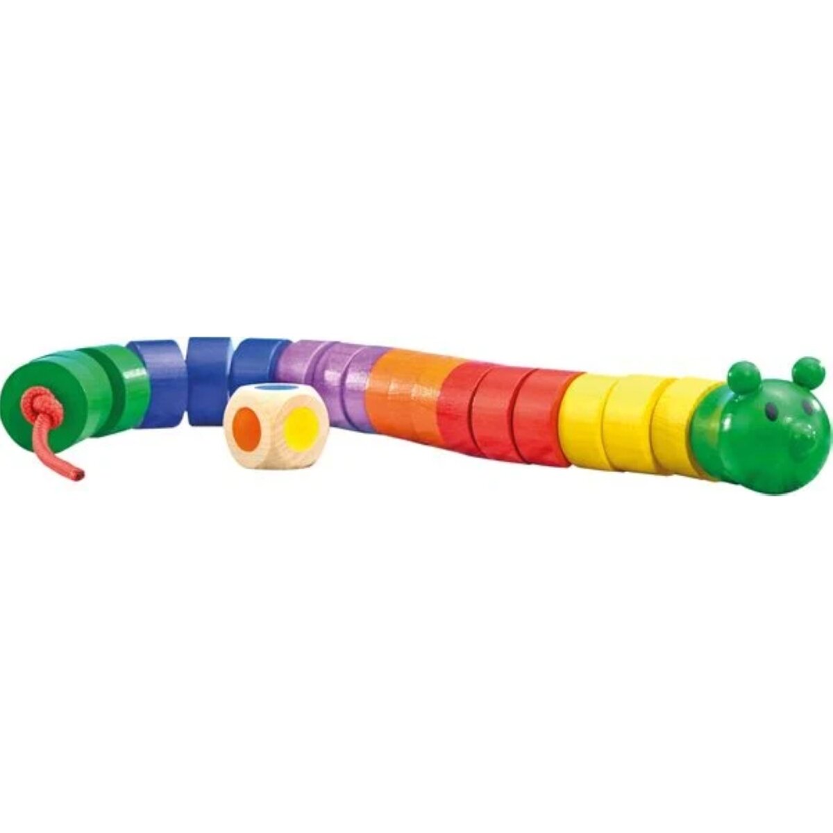 Wenn die Farbreihenfolge der bunten Scheiben stimmt, schlängelt sich die Raupe durchs Kinderzimmer. Dazu brauchen die Kinder Würfelglück und Fädelgeschick.