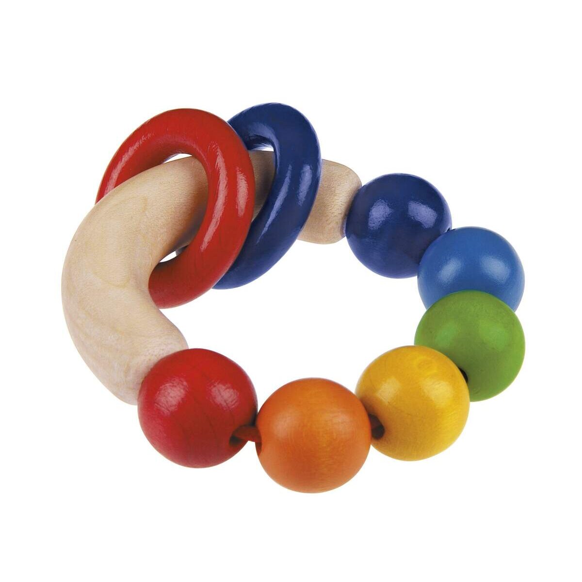 Der Greifling in bunten Regenbogenfarben ist bestens geeignet für erstes Tasten, Fühlen und Hören.