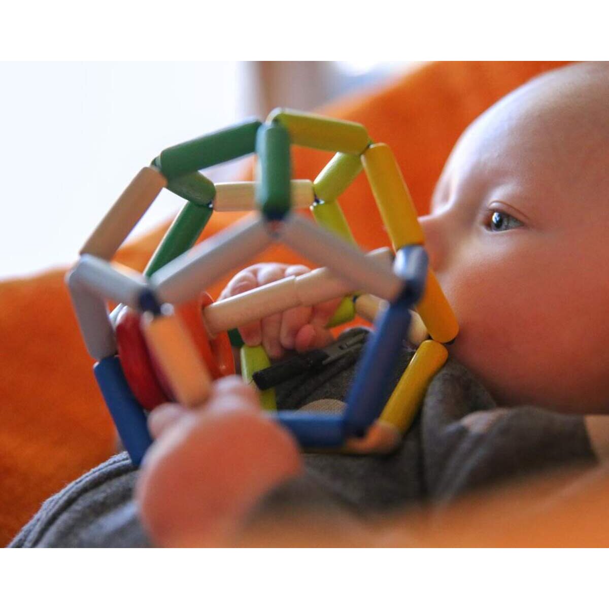 Hier darf nach Herzenslust geknautscht, gedrückt und gerollt werden! Auf faszinierende Weise findet der kunterbunt leichte Ball immer wieder in seine ursprüngliche Form zurück. Durch die großen Öffnungen lässt er sich an den vielen abgerundeten Perlenstäbchen ideal greifen. Die farbenfrohen Rasselringe belohnen die eifrigen Bewegungen des Babys mit anregendem Geklapper.
