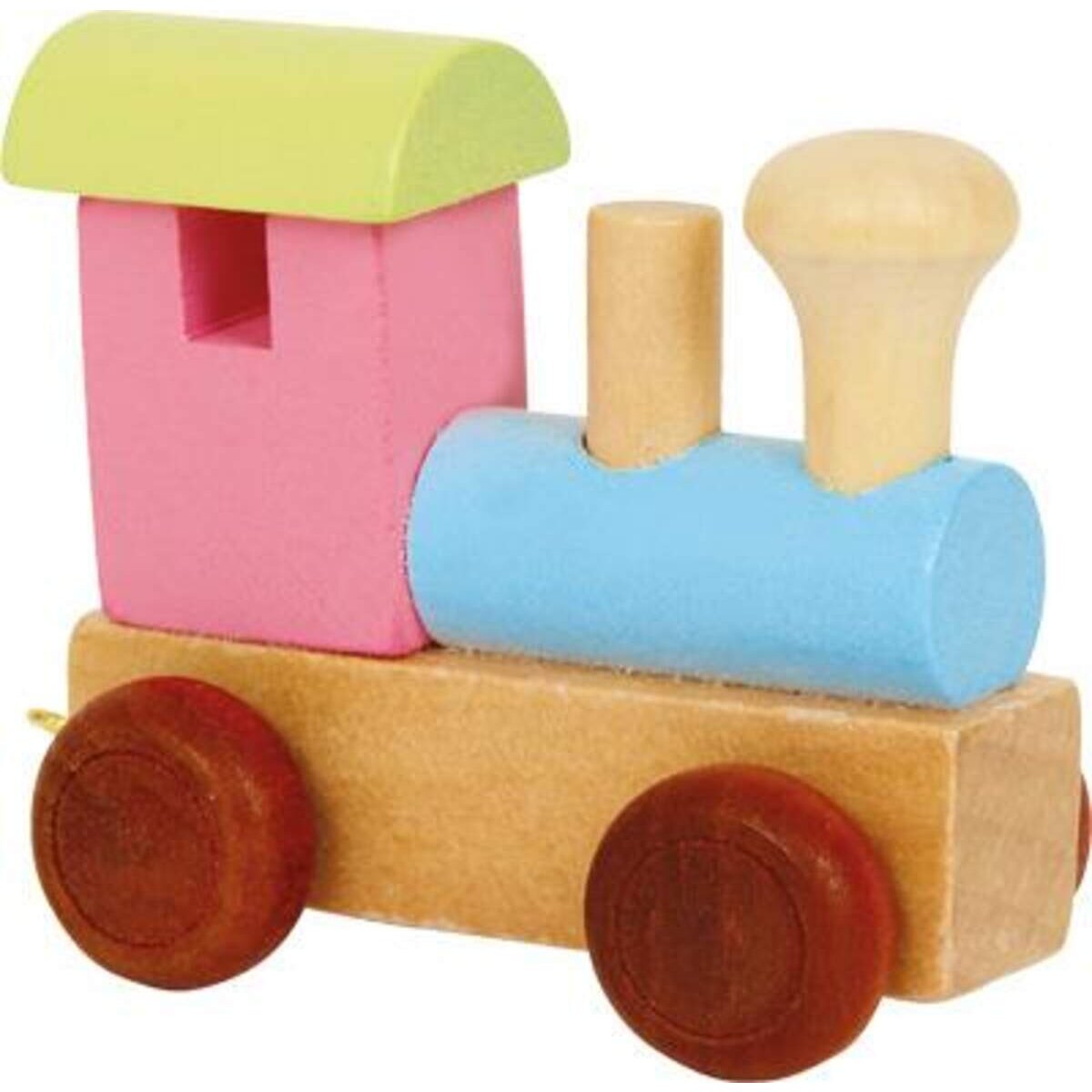 Wunderschöne, in Pastellfarben lackierte Holzlokomotive für den Buchstabenzug