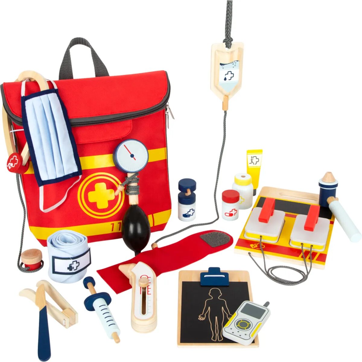 All-in-One für den Notfall! Mit diesem realistischen Rettungsrucksack in Signalfarben mit verstellbaren Riemen haben kleine Ersthelfer viele “echte” Utensilien aus dem Medizinbereich immer parat. Der doppelte Reißverschluss und Gummisteckplätze im Rucksack sorgen für Ordnung und schnellen Zugriff aufs Notfall-Equipment aus robustem Holz! Absolute Highlights des Notarzt-Spielsets sind das Blutdruckmessgerät mit Pumpball, das Otoskop mit echtem Vergrößerungsglas und der Defibrillator mit Tafelfeld!