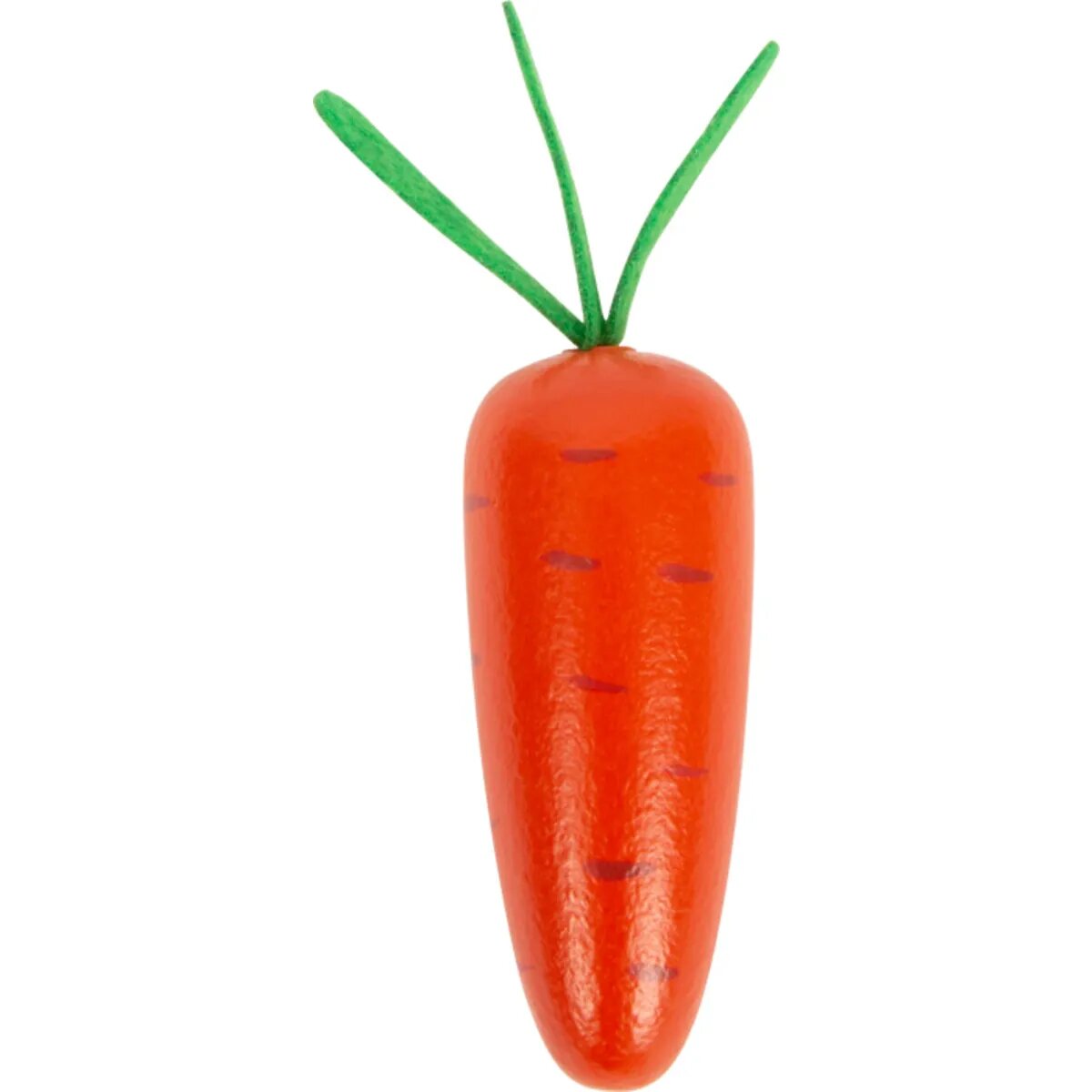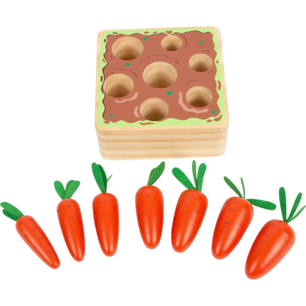 Möhrenziehen mal anders! Dieses bunte, kindgerechte Steck- und Sortierspiel aus Holz folgt der Montessori Pädagogik und animiert Kinder dazu, selbstständig zu vergleichen, zu sortieren, zu umfassen und zu strukturieren. Denn es gilt, die sieben unterschiedlich großen Karotten den passenden Löchern im "Beet" zuzuordnen. Grüne Filzapplikationen geben den Möhren ein realitätsnahes Design und eignen sich auch ideal als Rollenspielzeug für kleine Gemüsegärtner.