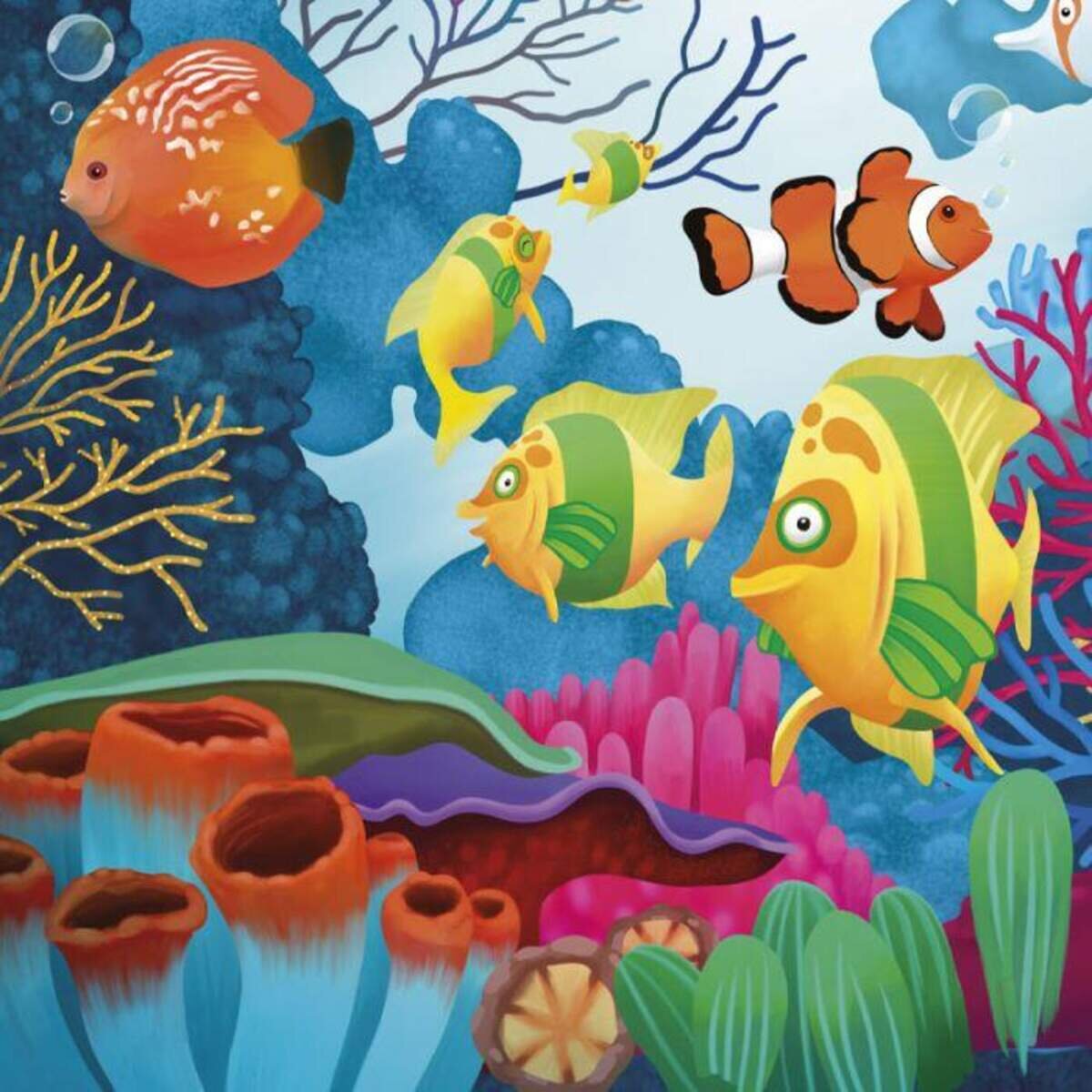 Platziere die vier magnetischen Puzzleteile auf den Feldern, do dass nur die Tiere, die in der Aufgabe abgebildet sind, auf dem Spielbrett sichtbar bleiben und alle anderen verdeckt sind.