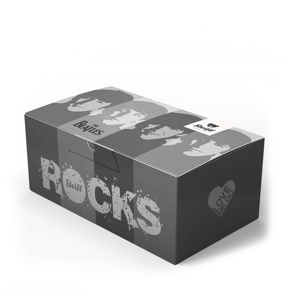 „Love, love me do...“ Auf dem Arm unseres Teddybären ist „Love Me Do“ gestickt. Es war die erste Single, die „The Beatles“ Ende 1962 veröffentlichten. Nach der Veröffentlichung ihres ersten Albums „Please Please Me“ Anfang 1963 wurde ihre Popularität so groß, dass der Begriff „Beatlemania“ geprägt wurde. Diese Ära der einflussreichsten Rockband aller Zeiten wird hier gewürdigt. Der Steiff Beatles Teddybär trägt einen schicken grauen Anzug und das charakteristische Schlagzeug der Beatles unter dem Arm. Steiff Rocks!