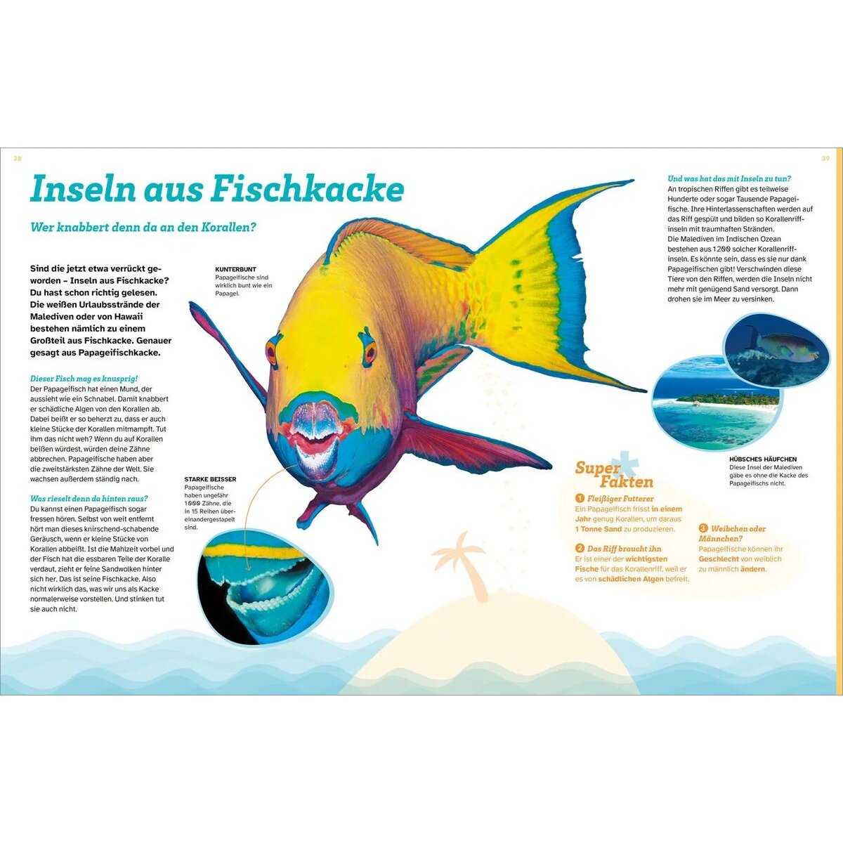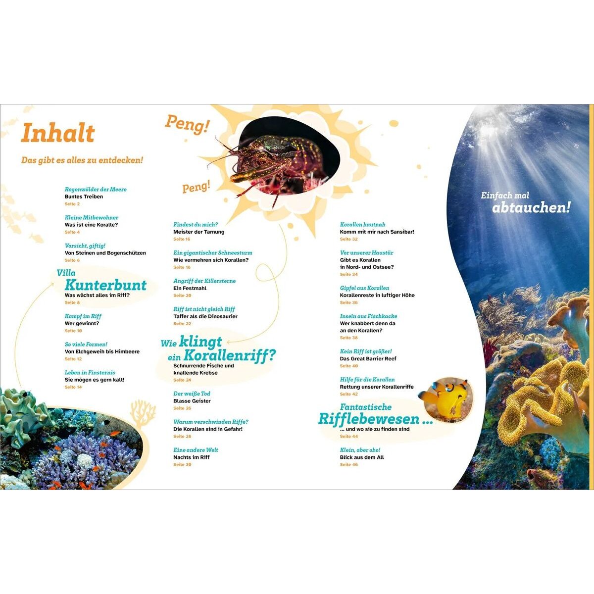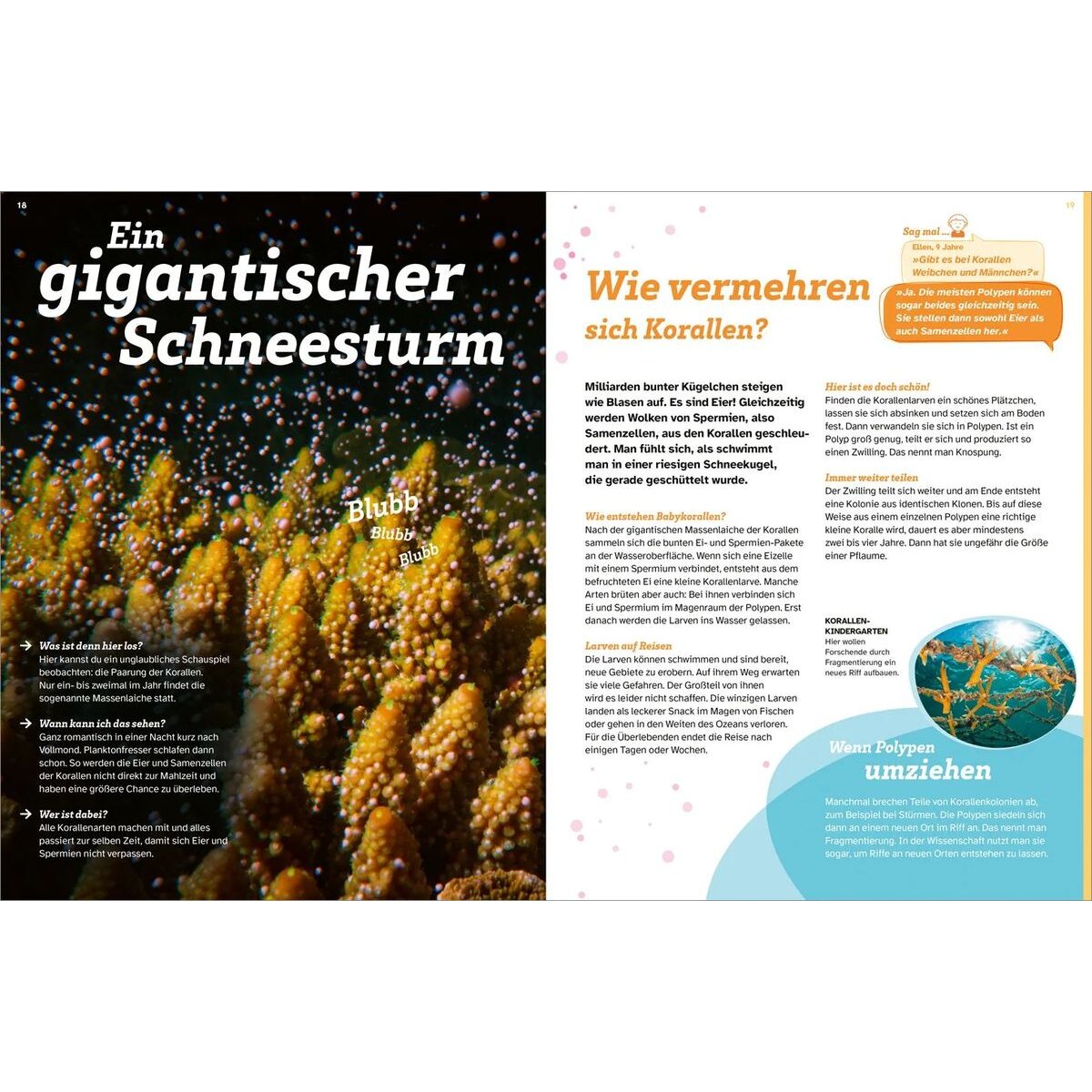Korallenriffe sind die größten Bauwerke, die je von einem lebenden Wesen geschaffen wurden. Große und kleine Korallen, die aussehen wie Fächer, Bäumchen, Himbeeren oder Geweihe leuchten in prächtigen Farben. Diese bunten Regenwälder der Meere gehören zu den artenreichsten Orten der Welt! Millionen von winzigen Nacktschnecken, gut getarnten Seepferdchen, bunten Seesternen und riesigen Schildkröten leben dort. Aber was sind eigentlich Korallen - Tiere oder Pflanzen? Wie entwickeln sie sich und was gefährdet sie? Die Leserinnen und Leser tauchen ab und finden heraus, wie Riffe entstehen, welche verschiedenen Arten es gibt, warum sie heute gefährdet sind und wie man sie schützen kann.
