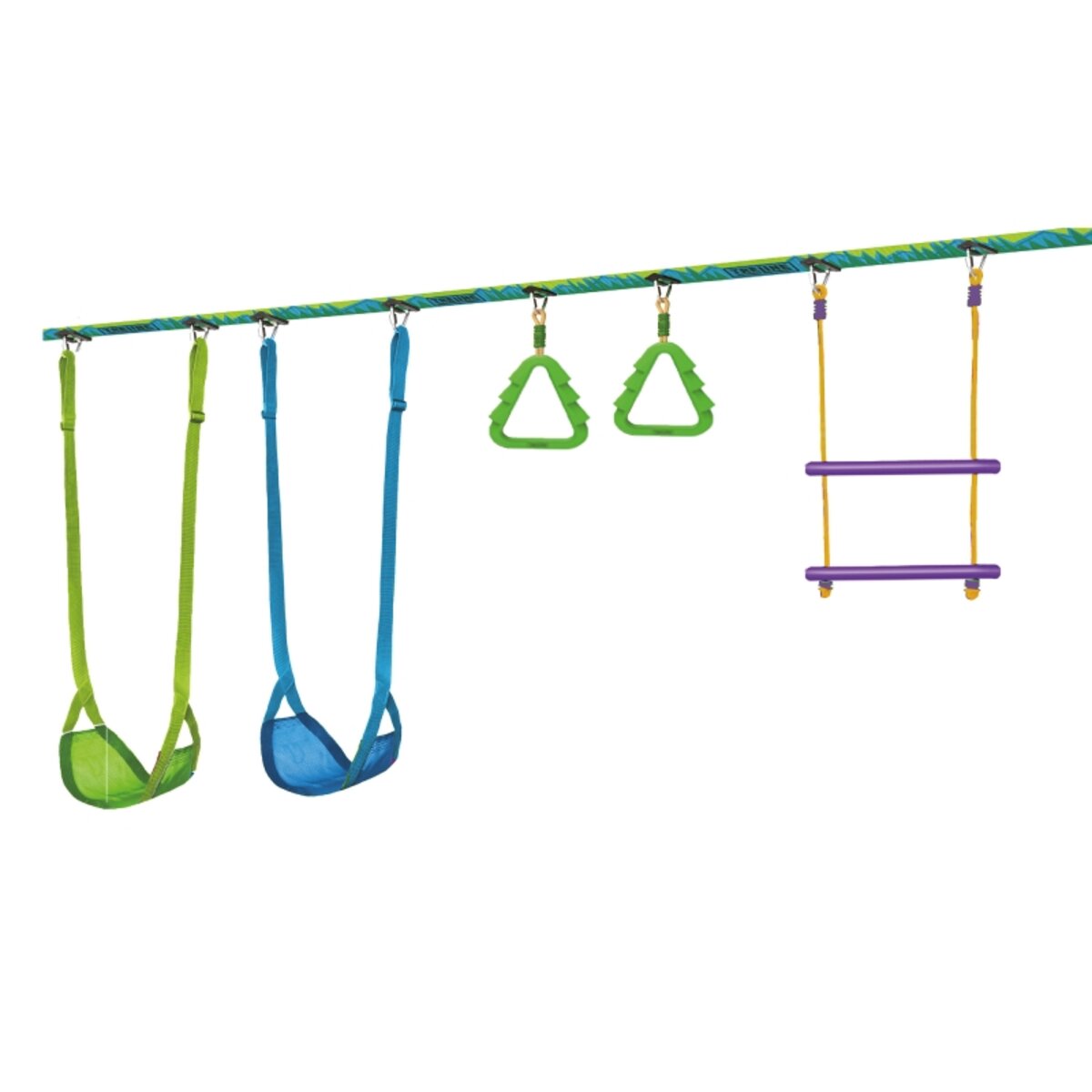 Für 1 bis 4 Kinder. Das Set enthält einen 11 m-Spanngurt, 2 verstellbare Schaukeln, 1 Set aus Gym-Ringen und einer Doppel-Trapezstange. Ganz einfach ein Schaukelset und einen Gymnastik-Spanngurt in wenigen Minuten zwischen 2 Bäumen aufbauen. Perfekt für alle Kinder, die Outdoor-Spiele lieben!